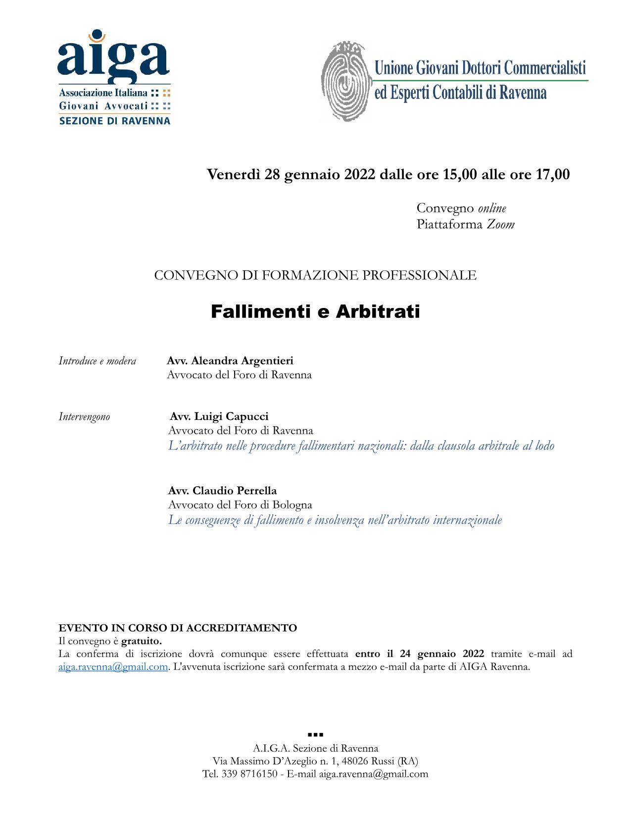 La conferma di iscrizione dovrà essere effettuata entro il 24/01/2022 tramite e mail ad aiga.ravenna@gmail.com.